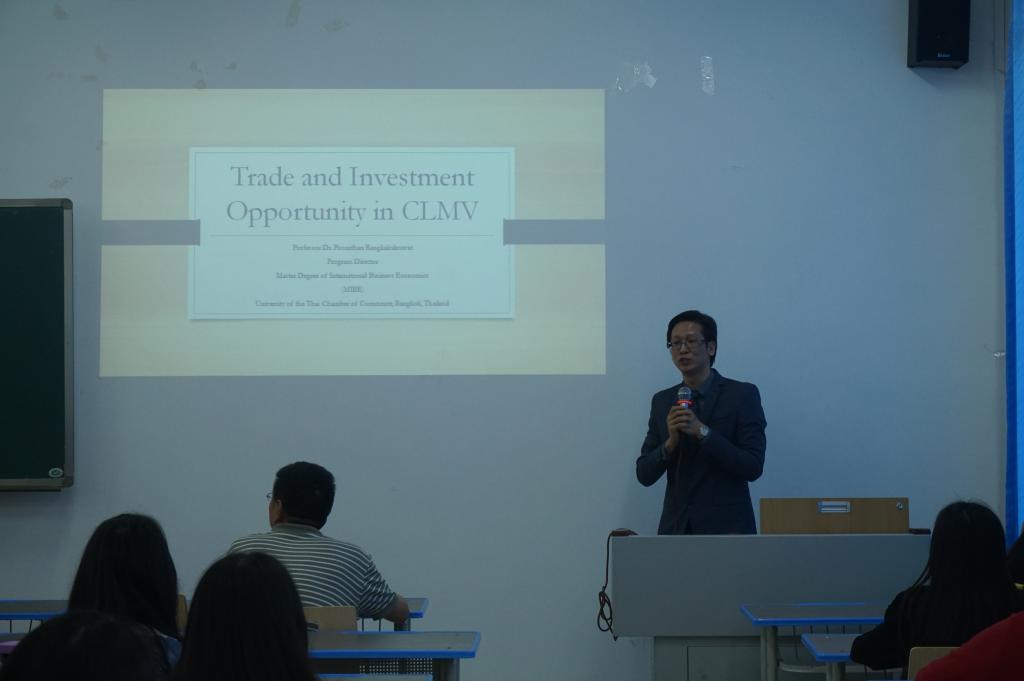 2016年5月9日下午15:00,泰国商会大学的经济学教授——颇袒(Poomthan Rangkakulnuwat)教授应邀在best365网页版登录102教室为我院学生做了一场题为“澜湄国家共同体—经贸与投资契机”的讲座,讲座由best365网页版登录院长田盈主持。