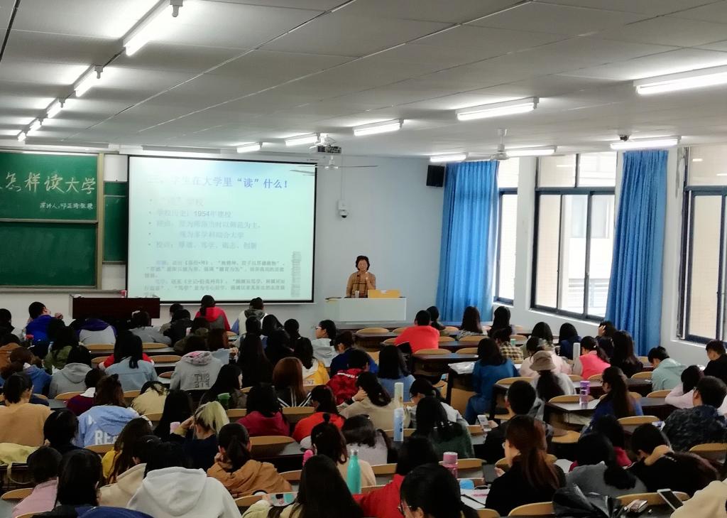 讲座伊始,邓教授引述人生成才的三部曲,并详细地讲解了中国与欧洲大学的产生和发展历程。随后,邓教授进入正题——大学生在大学里“读”什么?邓教授从多个角度极尽详细地为大一新生进行讲解,其一:读学校,包括本校的历史、特色、校训;其二:读专业,学院学科的理论基础、分支学科以及学生的培养目标等相关内容;其三:读大师,听讲座,读专著,聆听大师教诲,汲取大师智慧;其四:读图书馆,图书馆是大学的宝库,邓教授列举精读、泛读、选读、跳读、写读等多种高效的阅读方式;其五:读同学,同学之间应友好相处,并在竞争与合作中完善自我。紧接着,邓教授提出两种读大学的模式,导致走向两条截然不同的路。第一种是自觉自省、自律自强、自我认同成为人才的精英之路;第二种是自怨自艾、自暴自弃、自我认同成为废材的堕落之路。邓教授真切地希望莘莘学子走上前一条成才之路,并预祝同学们能够拥有丰富多彩的大学生活。
