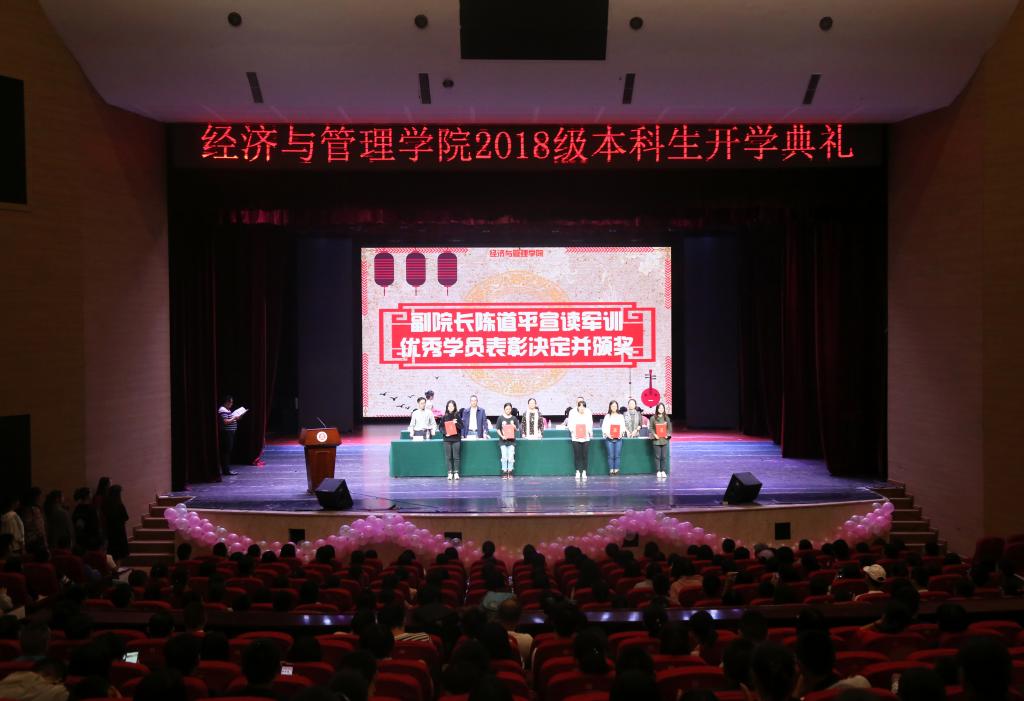 紧接着学习第六届师德标兵、学院教代会主任沈晓作为教师代表发言,希望2018级同学们努力学习专业技能,为自己未来最精彩的人生,打下最坚实的基础。随后高年级新生代表2016级人力资源管理1班靳超同学和新生代表2018级工商管理类1班喻园媛同学依次发言。最后,学院对2018级军训优秀学员进行了表彰。
