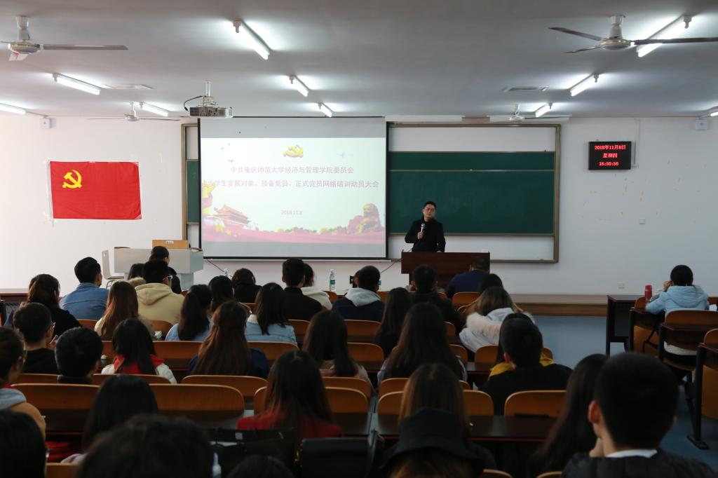 为持续推进“两学一做”学习教育常态化、制度化,引导大学生发展对象、预备党员、正式党员深入学习、准确理解习近平新时代中国特色社会主义思想和党的十九大精神,加强理论武装,坚定理想信念,增强党员意识,提升党性修养,发挥党员先锋模范作用,学思践悟、知行合一,争做新时代“四讲四有”合格党员。2018年11月9日下午4点40,中共best365网页版登录委员会在励志楼2315教室开展了大学生发展对象、预备党员、正式党员网络培训动员大会。参加大会的有best365网页版登录党委副书记任源钢,各学生党支部支部书记,以及全体大学生发展对象、预备党员、正式党员。
