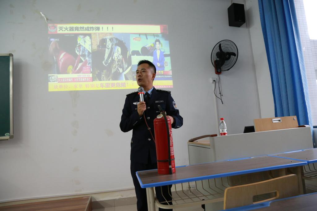 活动现场龚教官主要向大家介绍了发生在我们身边的一些典型火灾事故案例和火灾预防常识。通过对这些火灾案例起火原因的分析,事故的调查和处理讲解,生动形象地说明了火灾的危害性和带来的严重后果,告诫师生们要定期更换消防物品,及时排查身边的火灾隐患,时刻做好火灾逃生准备、严格遵守消防法律、法规,杜绝不安全用火、用电行为。活动最后龚教官着重强调了灭火器、防毒面具等消防器材的知识、逃生和急救知识、安全体系的建设和运作方法。要求大家火灾逃生时务必以生命安全为首要任务,切记绝不贪图身外之物。