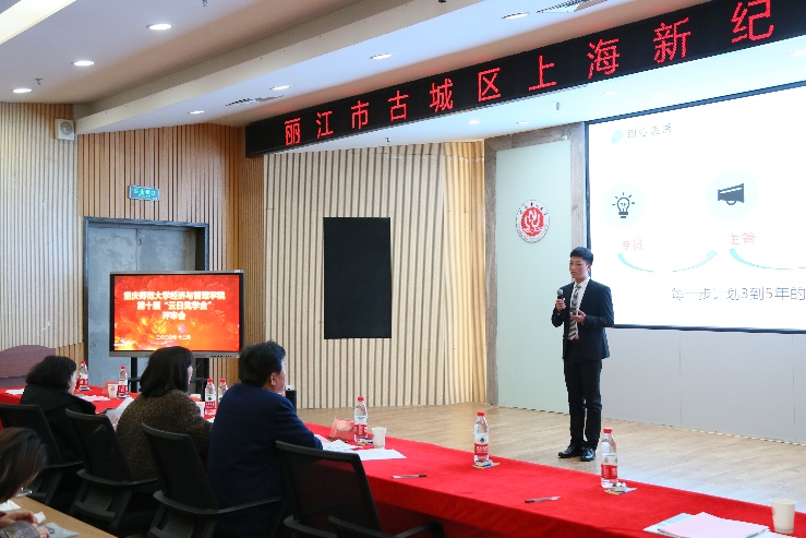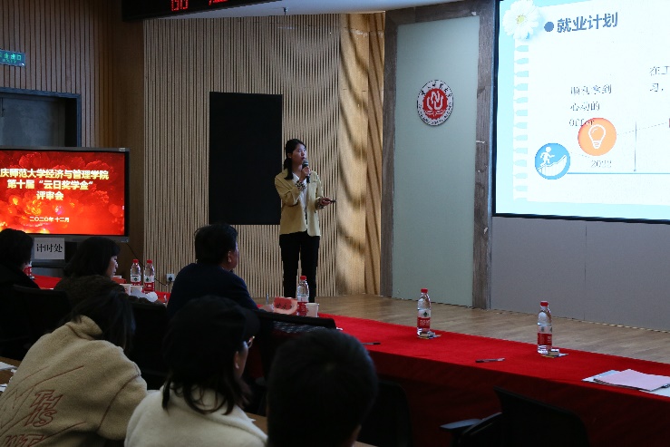 本次评审分为自我展示、评审专家提问、评委打分三个环节。评审会正式开始后,选手们依次上台进行演讲,通过精彩的幻灯片展示,从自我介绍、社会实践、未来展望等方面对自己进行了多角度综合评价及全方位的自我展示,全面汇报了个人在思想、学习、科研、实践和志愿服务等方面的丰富经历和突出表现,如江清清同学对自己两次竞选同一兴趣小组组长的深刻剖析,谢辉饶同学大方自信、条理清晰的自我展示,刘畅同学如他名字般“流畅”而又与众不同的PPT表达等。选手们大方自信,朝气蓬勃,尽显经管学子的精神风貌!在评委提问环节,师生之间进行了更加深入、细致的交流,选手们思维敏捷、条理清晰、应对如流,给现场评委留下了深刻印象,赢得了评审委员会的一致好评。