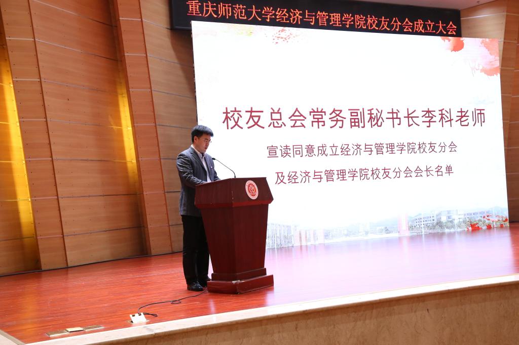 重庆师范大学校友总会常务副秘书长李科老师宣读同意成立best365网页版登录校友分会的批复文件,以及best365网页版登录校友分会会长名单,并寄望分会坚持中国共产党领导,自觉遵守国家宪法及相关法律法规,积极开展校友联络工作。服务、吸纳和凝聚广大校友,组织开展正能量活动,为母校校友工作助力。