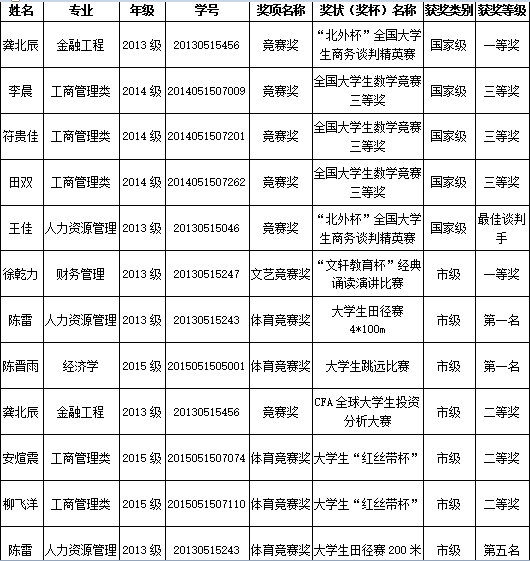 我院2013级金融工程专业龚北辰、王佳、李晨等同学荣获国家级比赛奖项,2013级财务管理专业徐乾力和人力资源管理专业的陈雷同学等多人荣获市级奖励。
