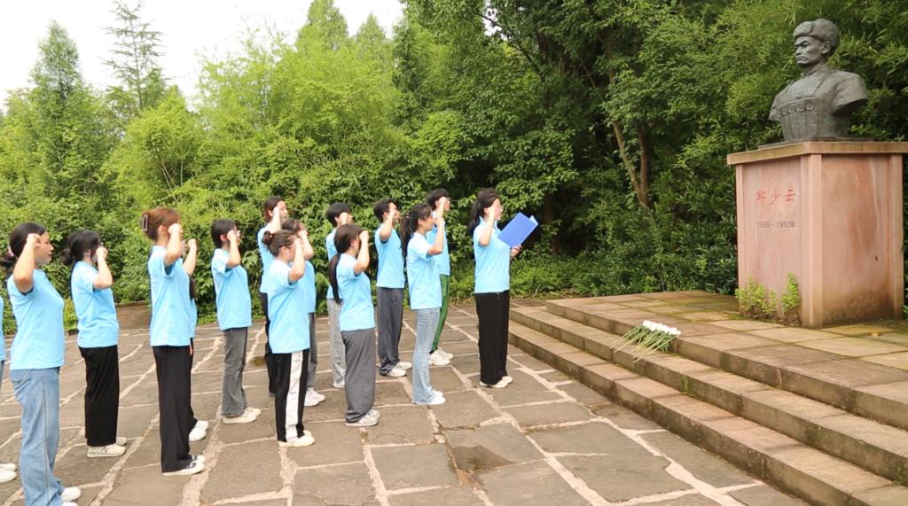 参观后,学子们在故居前肃立,手持党旗高唱《我和我的祖国》,表达了对祖国的热爱和对英雄的敬意。接着,在邱少云雕像前庄严宣誓,誓言充满忠诚与热爱。宣誓后,学子们向雕像鞠躬,致敬英雄。