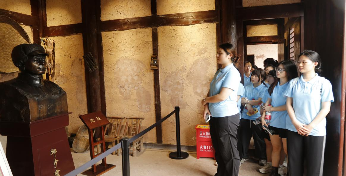 在讲解员带领下,实践团成员探访邱少云故居,感受其奋斗历程。故居陈设古朴,家具斑驳,见证其英勇事迹和卓越贡献。故居正中央的雕像,目光如炬,身姿挺拔,象征随时奔赴战场。雕像下摆放着邱少云的家书,字迹工整、情感真挚,表达了邱少云同志对家人和祖国的深深眷恋。学子们深受触动,对红色文化产生更深敬仰和认同。
