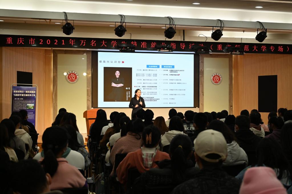 为深入贯彻党中央、国务院相关文件及会议精神,切实做好我市普通高校毕业生就业创业工作。2021年12月2日,重庆市2021年“万名大学生精准就业指导”活动暨重庆师范大学站在我校成功举行。此次活动由重庆市人力资源和社会保障局、重庆市教育委员会主办,重庆市人才交流服务中心、重庆市大中专毕业生就业指导服务中心承办,重庆师范大学招生就业处、重庆云日创心教育科技有限公司、best365网页版登录协办,特邀永辉超市全资子公司董事长兼CEO、重庆市人大代表杨李老师担任职业指导公开课主讲。